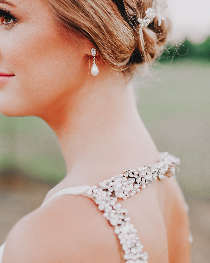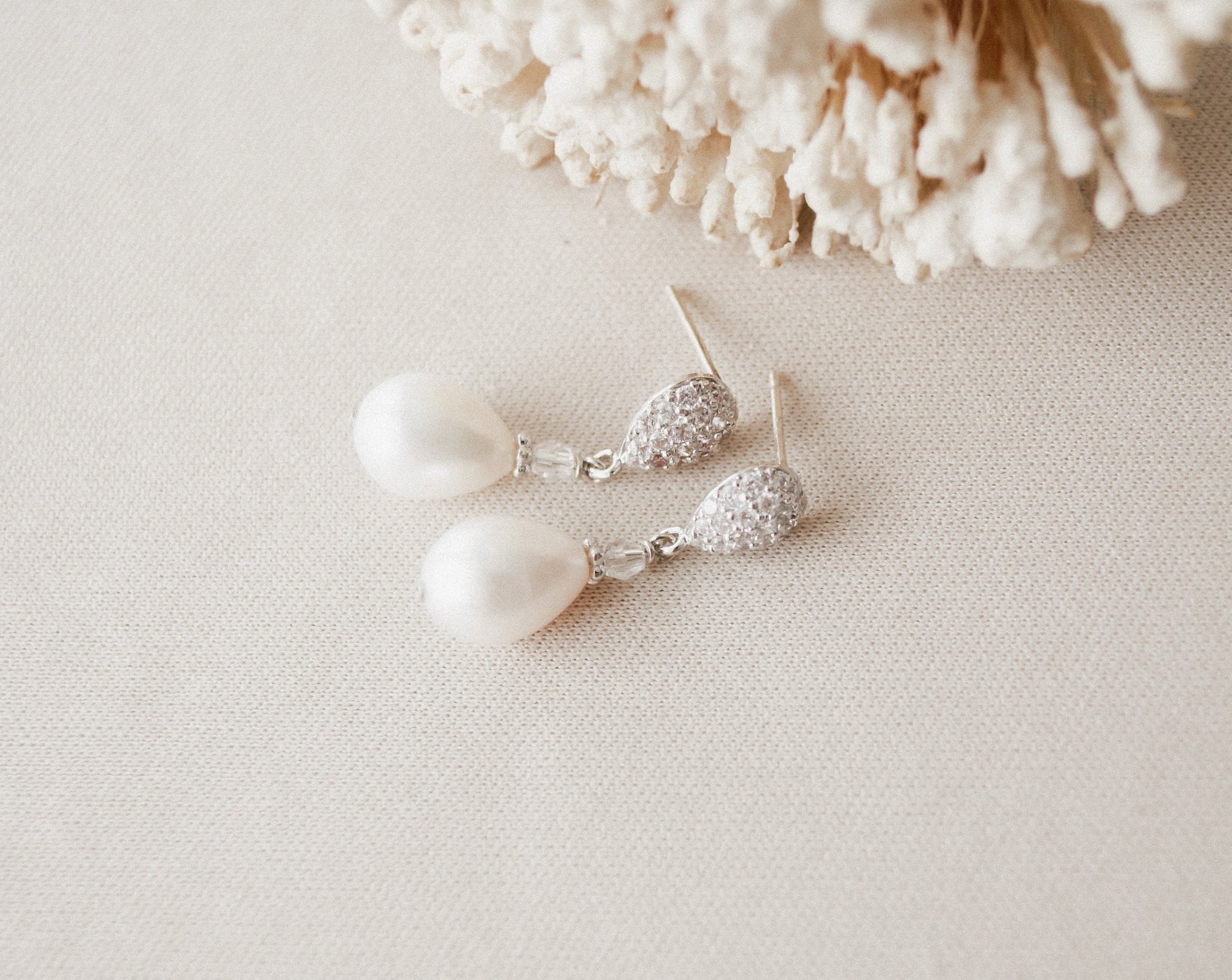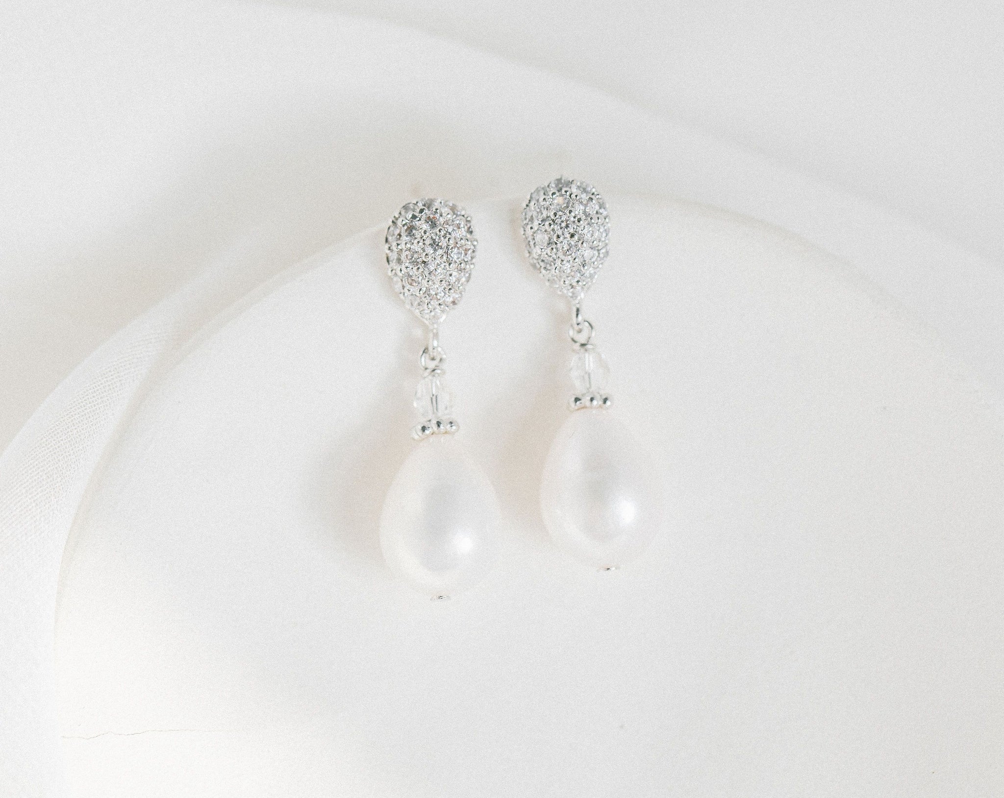 Pavé stud (cz stones) Rhodium plating, with sterling silver post (portion that goes through your ear) Freshwater pearls (natural white) - smooth and lustrous Silicone comfort backings included - only the best for our brides! Made-to-order in our...Read more
