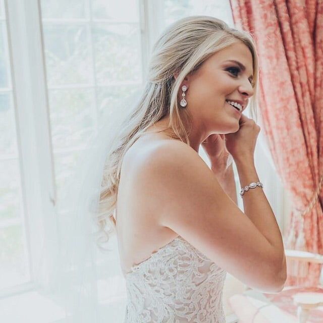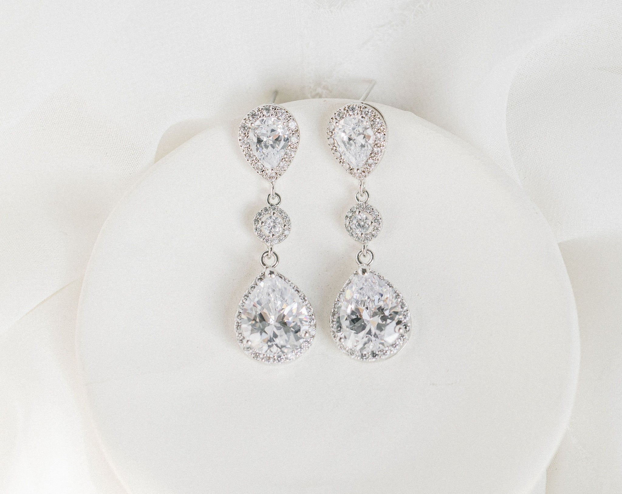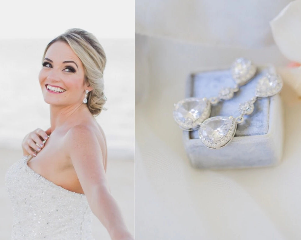Designed with halo teardrop CZ stones The settings are rhodium-plated, but the stud (part that goes through your ear) is sterling silver Includes our signature silicone comfort backings (only the best for our brides!) Made-to-order in our Ottawa,...Read more