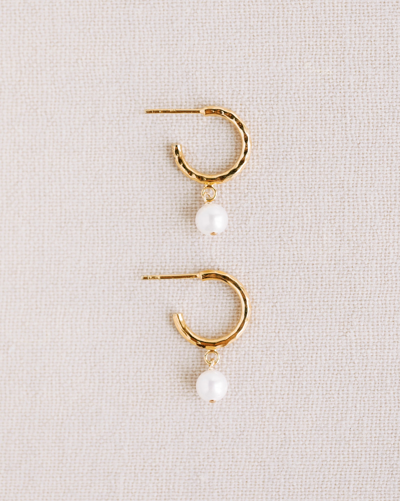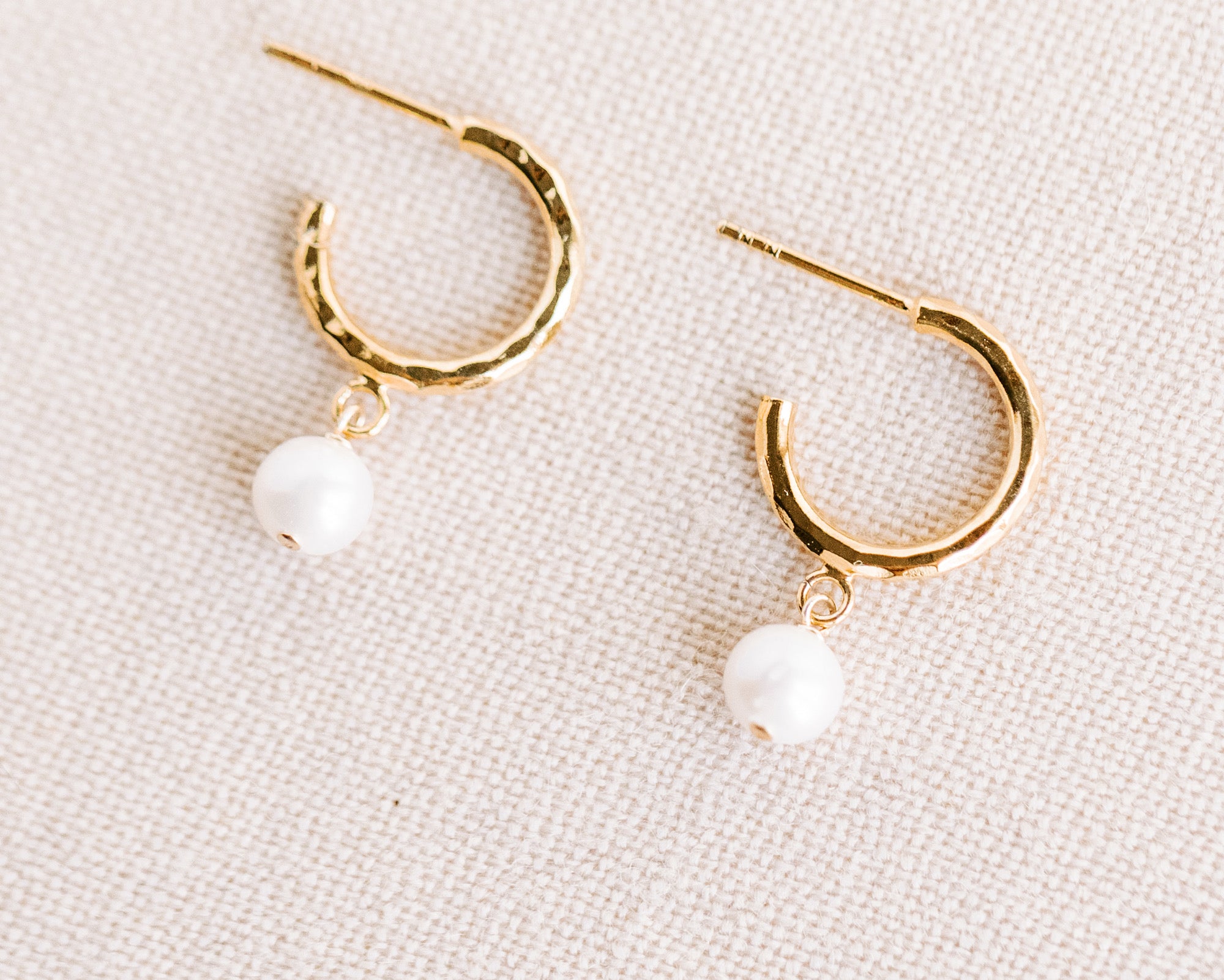 - Freshwater pearls (6mm) dangling from textured hoops