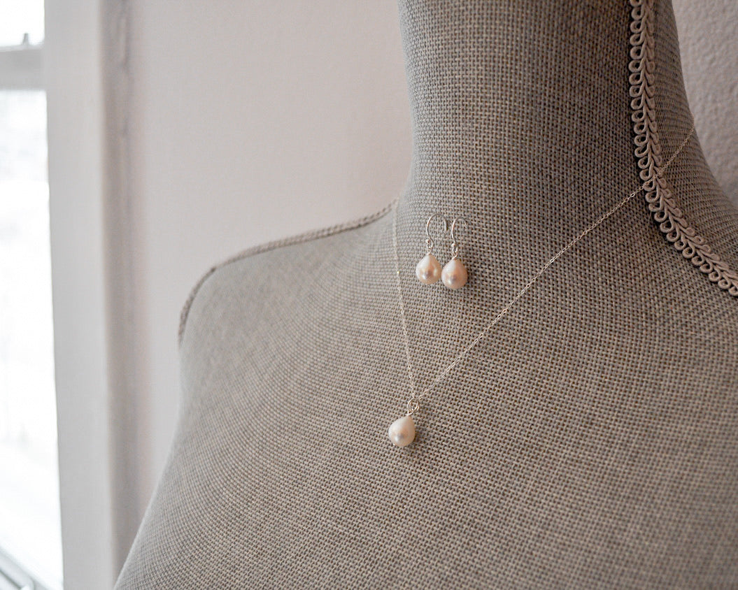 Our classic pearl earrings + pendant set Choice of either Freshwater pearls (natural white), or Swarovski 'crystal pearls' (white or ivory) Our freshwater pearls are smooth and lustrous. They are a 'natural white' tone, which coordinates beautifully with...Read more