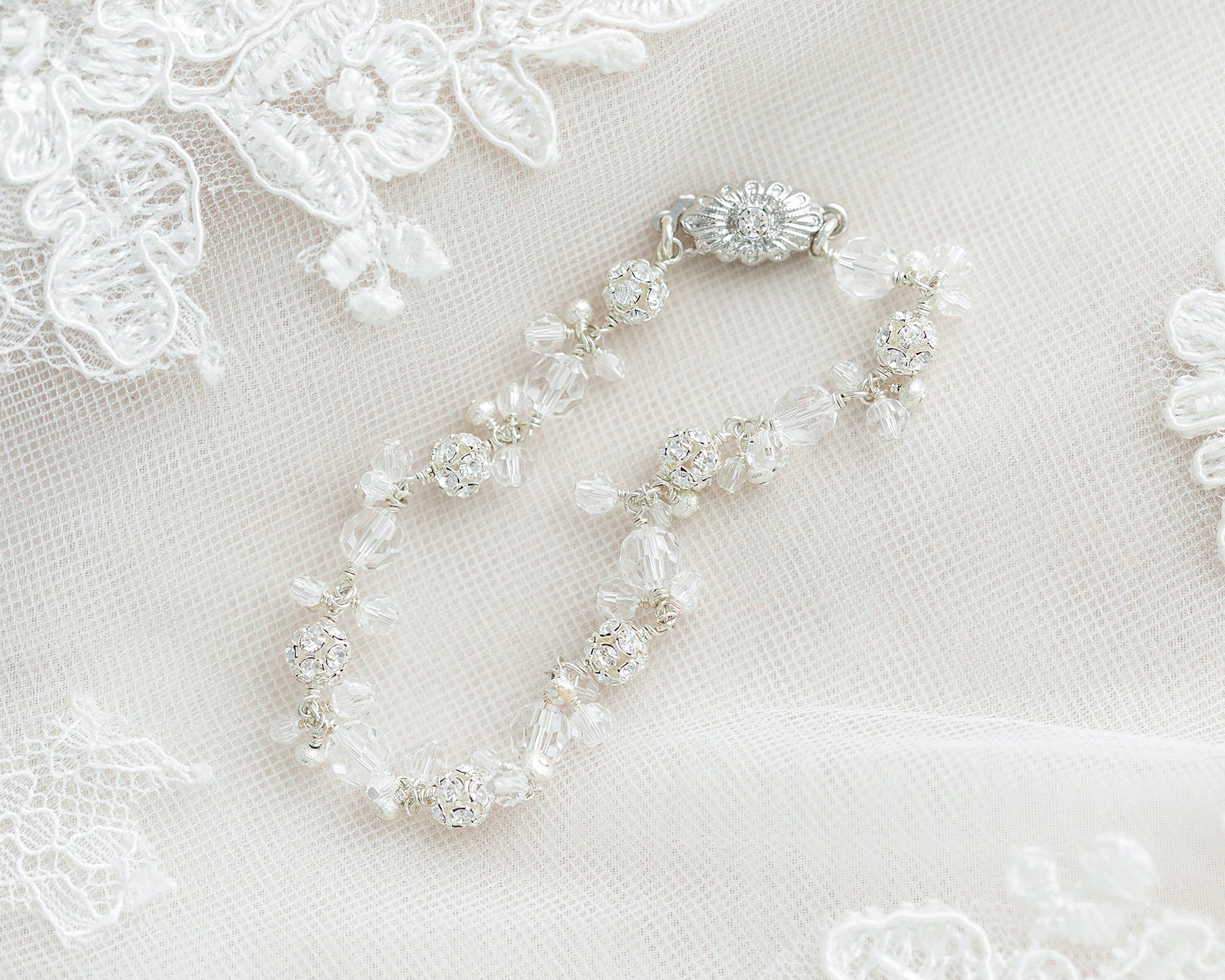 Designed with Swarovski Elements + sterling silver Crystalized clasp (rhodium) Clear Swarovski crystals + your choice of accent: either crystallized Swarovski balls -OR- sterling silver stardust balls. Please note that the crystallized balls are prone to catching on...Read more