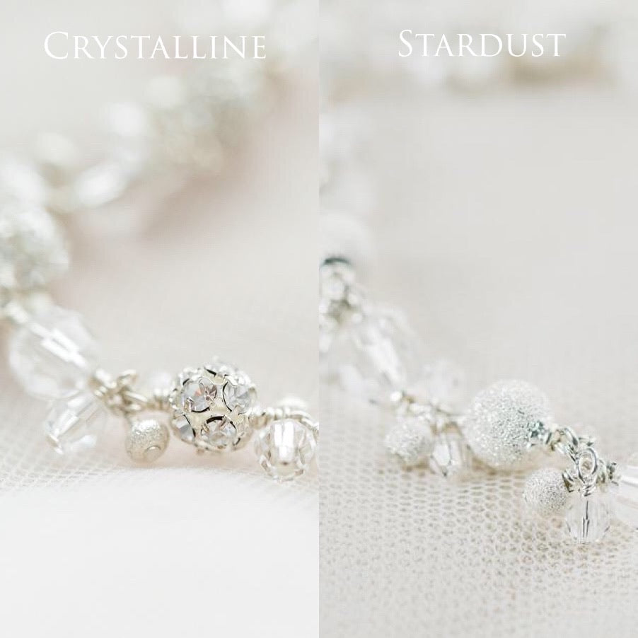 - Clear Swarovski crystals + your choice of accent: either crystallized Swarovski balls -OR- sterling silver stardust balls. Please note that the crystallized balls are prone to catching on delicate fabrics, whereas the stardust balls will not catch on anything