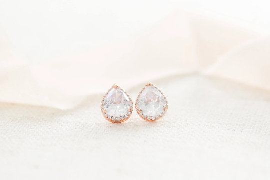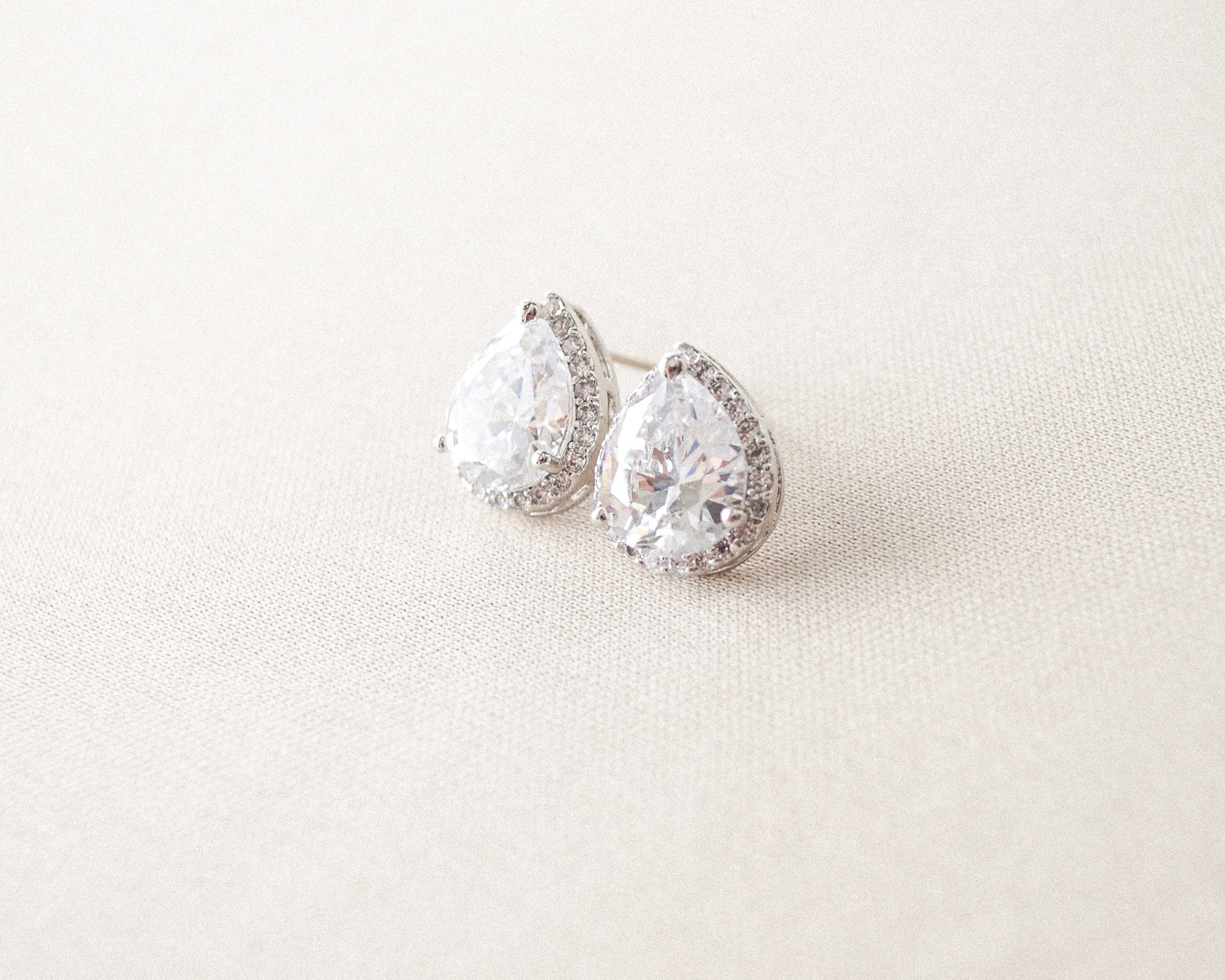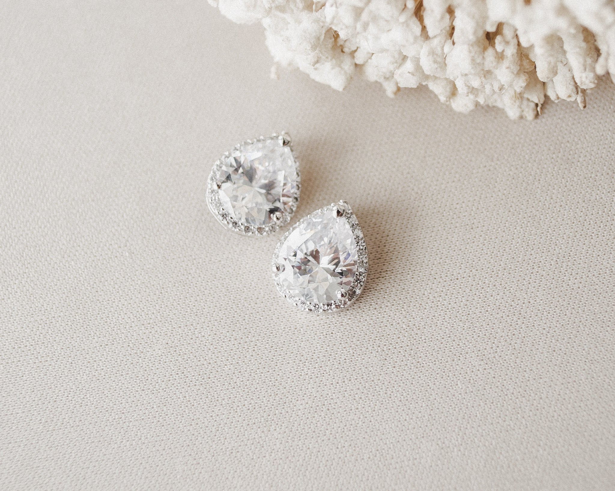 Teardrop CZ stones with a beautiful pavé halo Rhodium-plated settings, with sterling silver posts (the part that goes through your ear) Comes with our signature comfort backings Made-to-order in our Ottawa, Canada studio. 15.5mm lengthwise When will my...Read more