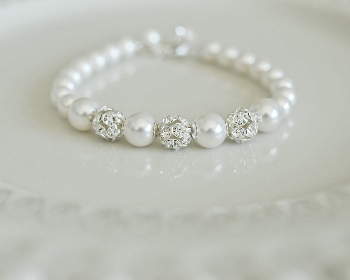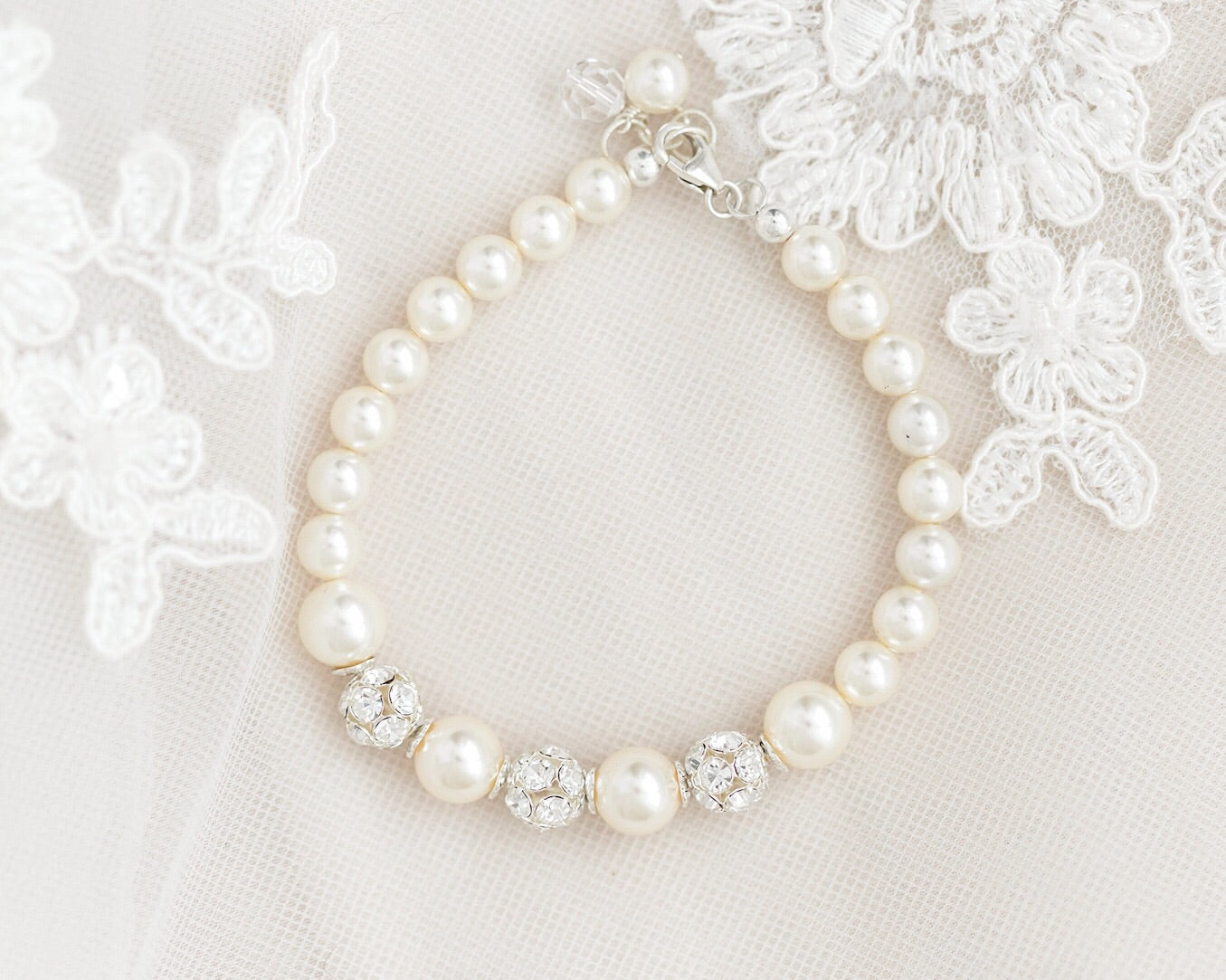 Designed with Swarovski 'crystal pearls' Swarovski Elements accents Lobster claw clasp, with mini extender chain Made-to-order in our Ottawa, Canada studio. Please select exact wrist measurement (measured snug around the bone with a measuring tape). Your bracelet will be made...Read more