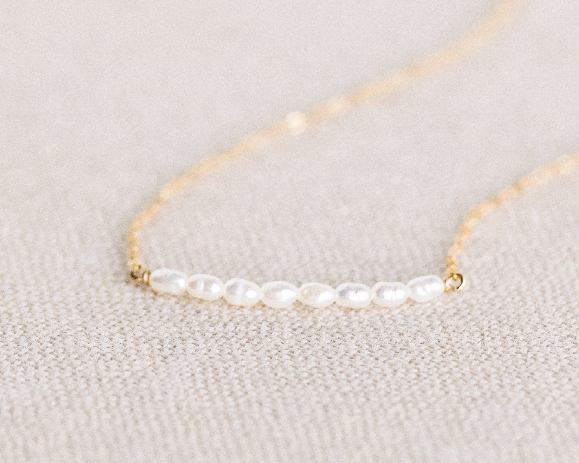 A minimalist bar of small rice-shaped freshwater pearls Choice of Sterling Silver or 14kt Gold-f (rose or yellow) Small spring clasp + mini extender (to customize your fit!) Made-to-order in our Ottawa, Canada studio. Please include your exact wrist...Read more