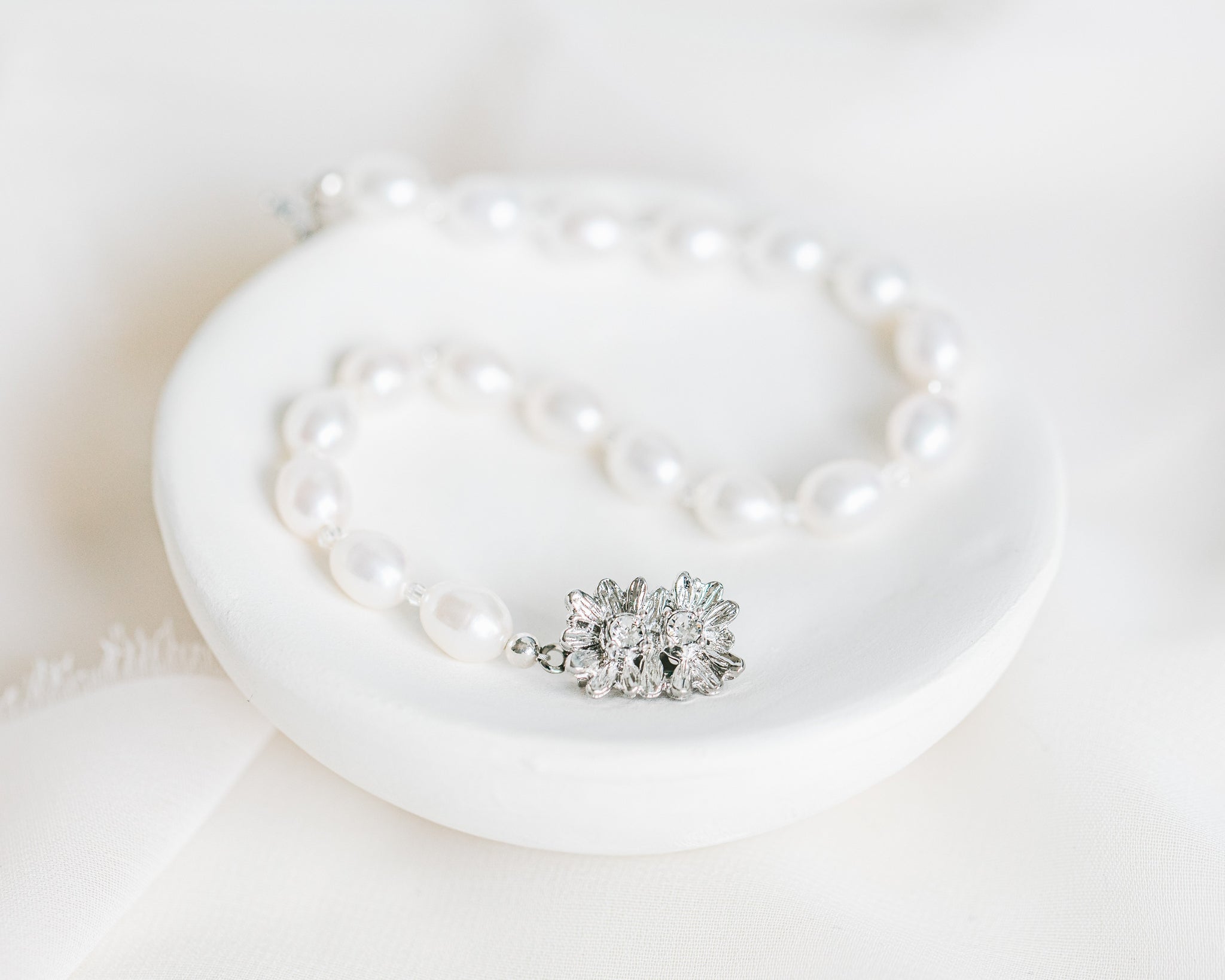Beautiful strand of rice-shaped freshwater pearls Swarovski crystals (2mm) between each pearl Secure Rhodium box clasp (with Swarovski Crystal accent) Made-to-order in our Ottawa, Canada studio. Please include your exact wrist measurement in the checkout. Be sure to measure snug...Read more