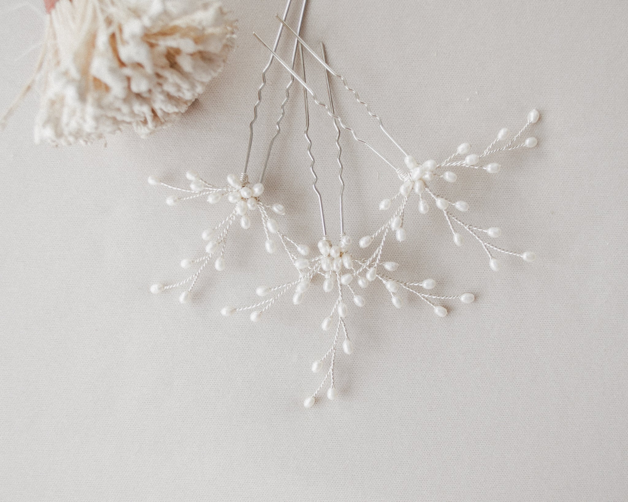 Vine spray pins with beautiful rice-shaped freshwater pearls These pins are versatile - wear them spread out or clustered together! They look beautiful in any updo! Branches are flexible / handle with care Handcrafted with love - wired...Read more