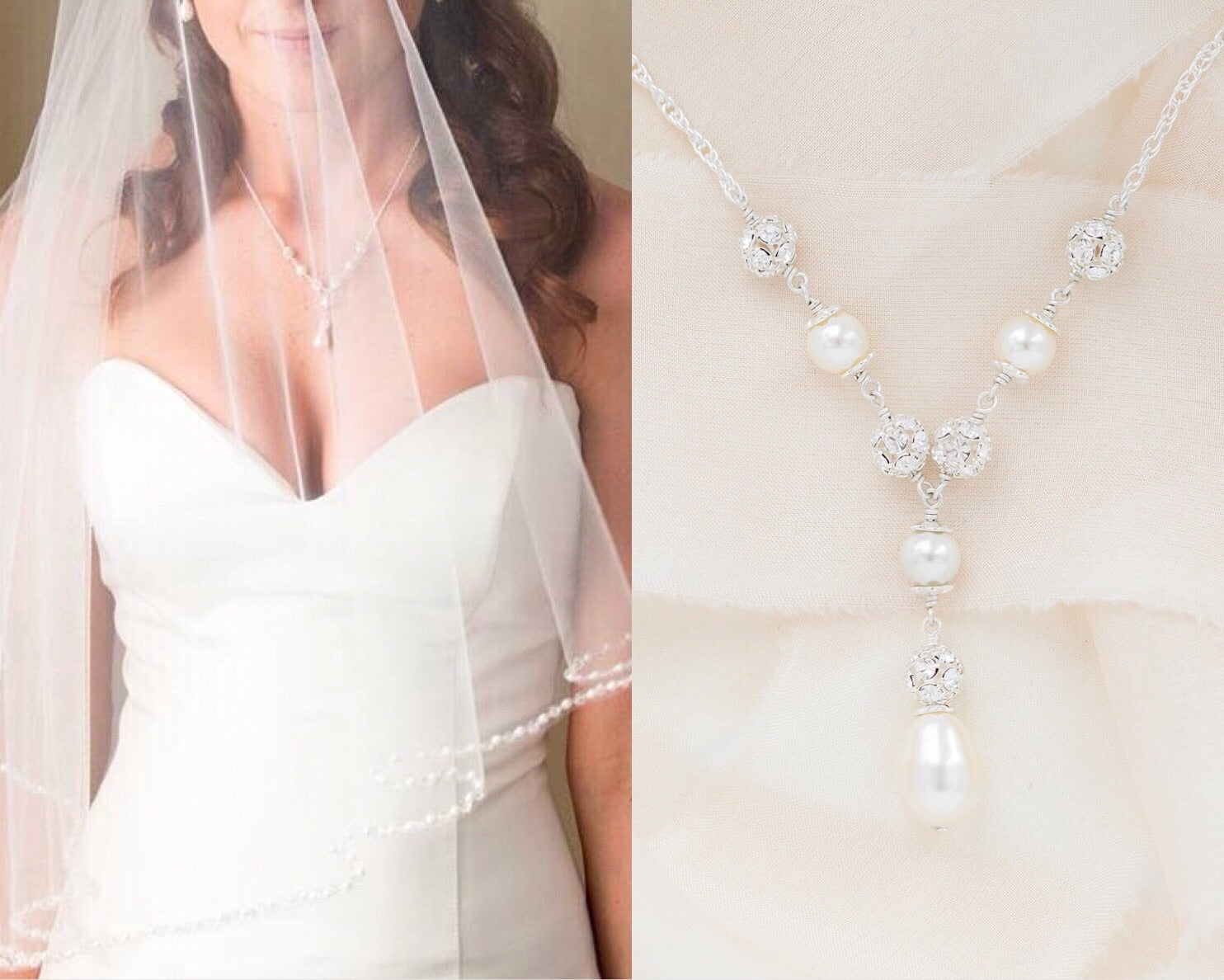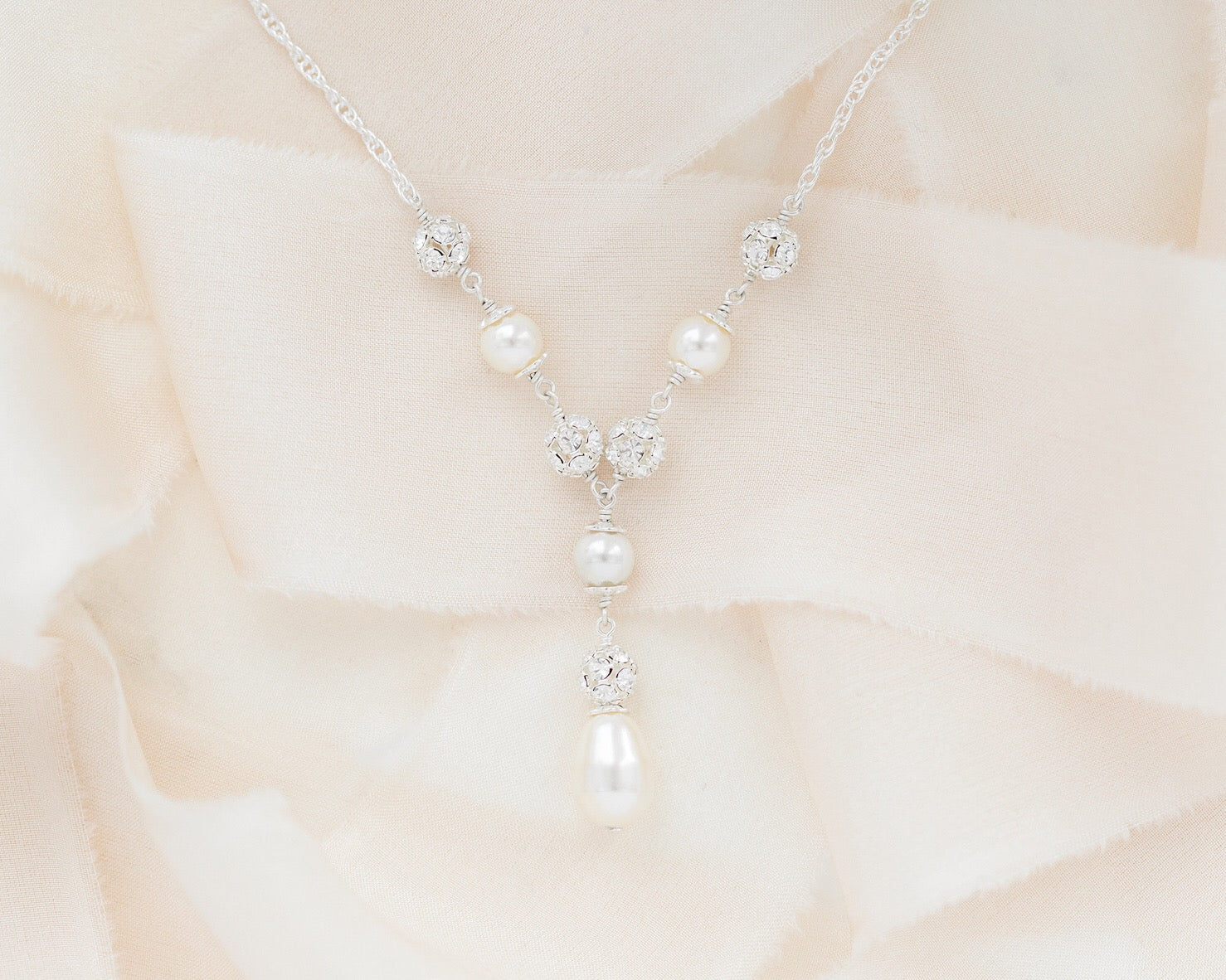 A classic Y-design, perfect for a sweetheart neckline Sterling Silver Small spring clasp with delicate 2" extender at back Choice of Swarovski “crystal pearls” (white or ivory), or freshwater pearls (which are a natural white tone that coordinate...Read more