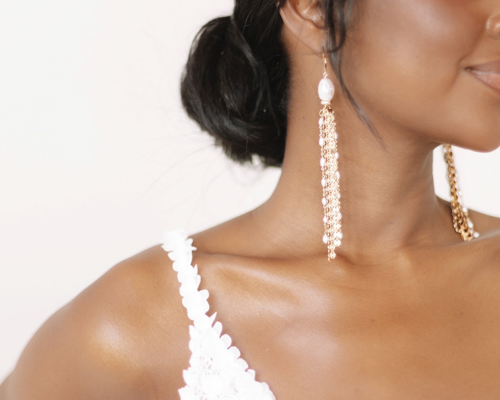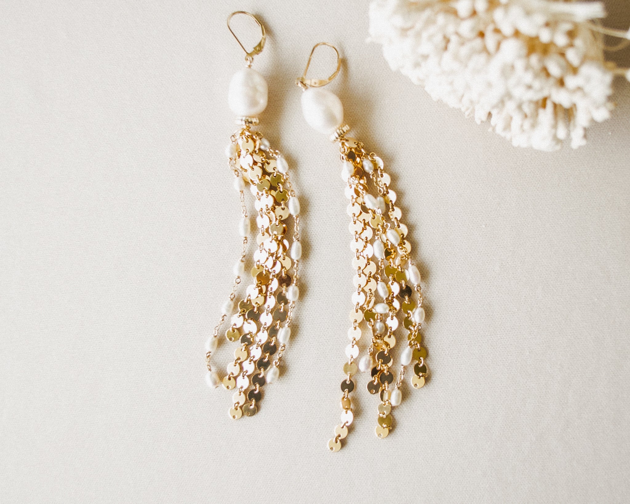 Freshwater pearl tassel earrings Choice of metal: 14kt Yellow Gold F (shown), or Sterling Silver Leverback earring attachment (securely snaps closed) 4” long Made-to-order in our Ottawa, Canada studio When will my order ship? What is your return...Read more