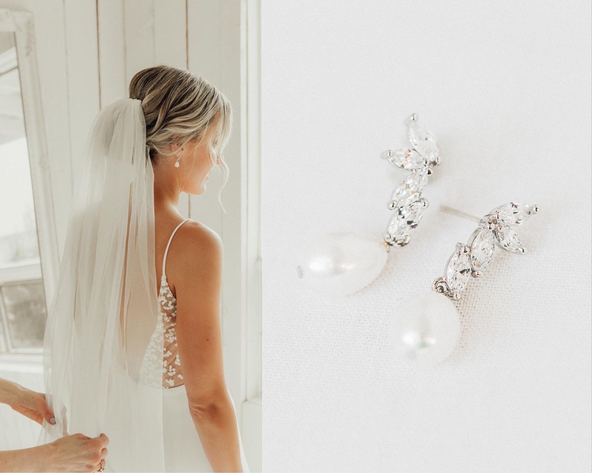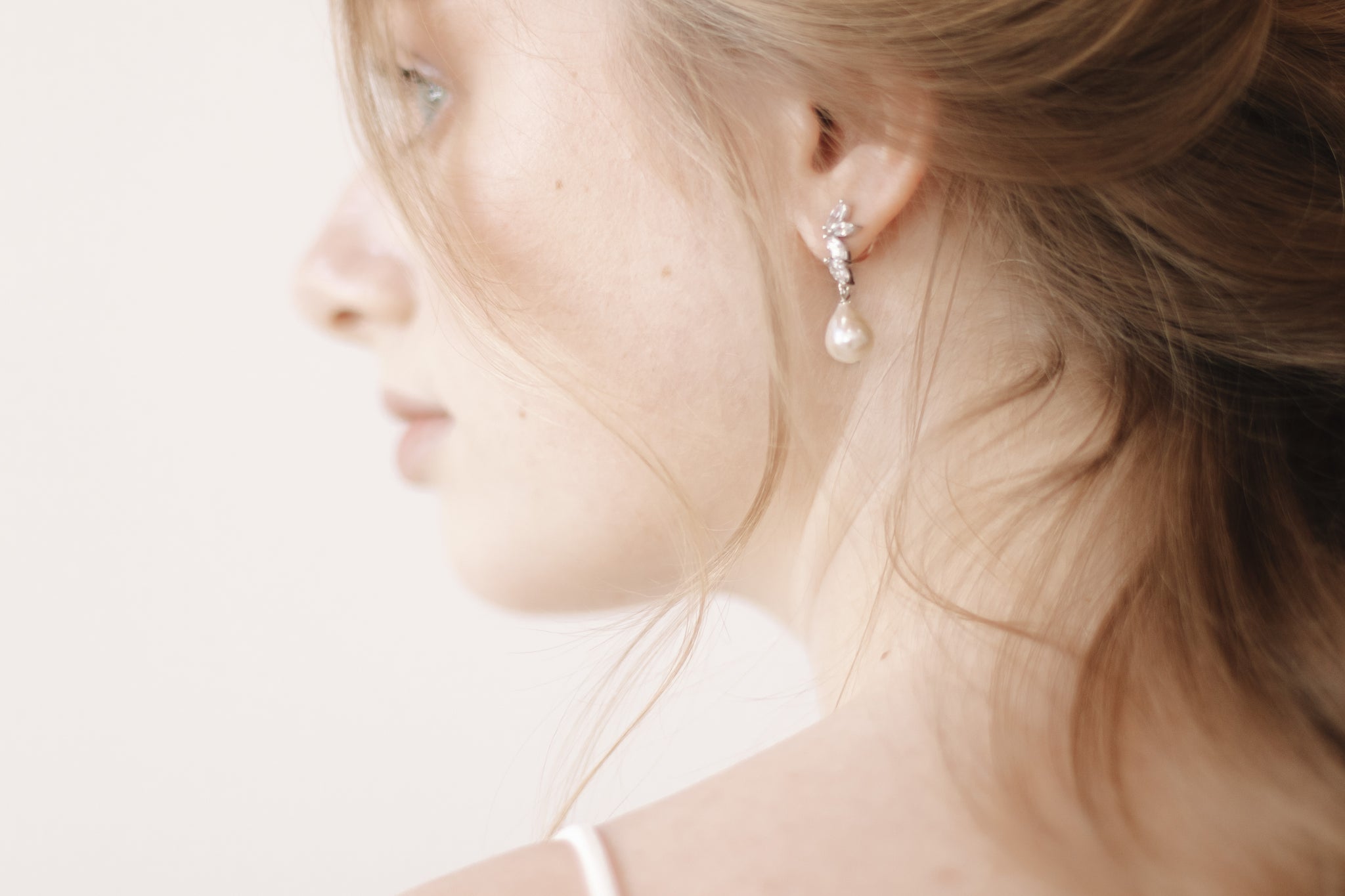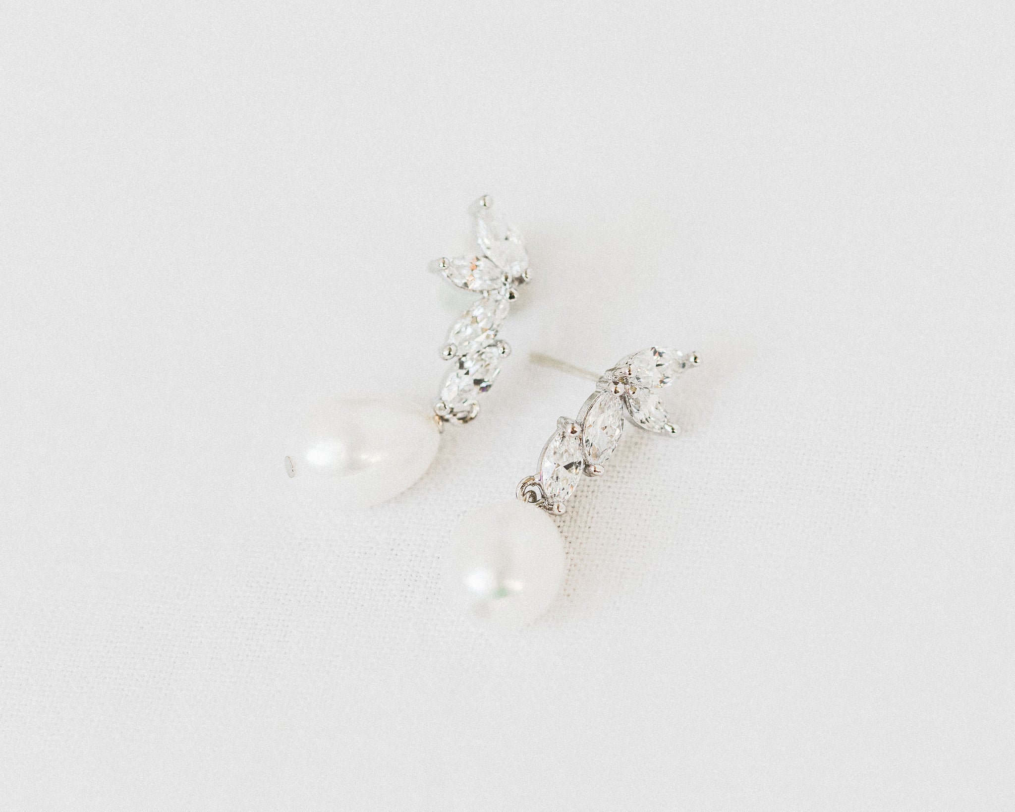 Marquise crystal stud Freshwater pearl teardrop (~10-11mm) Sterling silver post (rhodium settings) Smooth and lustrous freshwater pearls (which are a natural white tone that coordinate beautifully with any dress colour) Freshwater pearls are made in nature - no...Read more